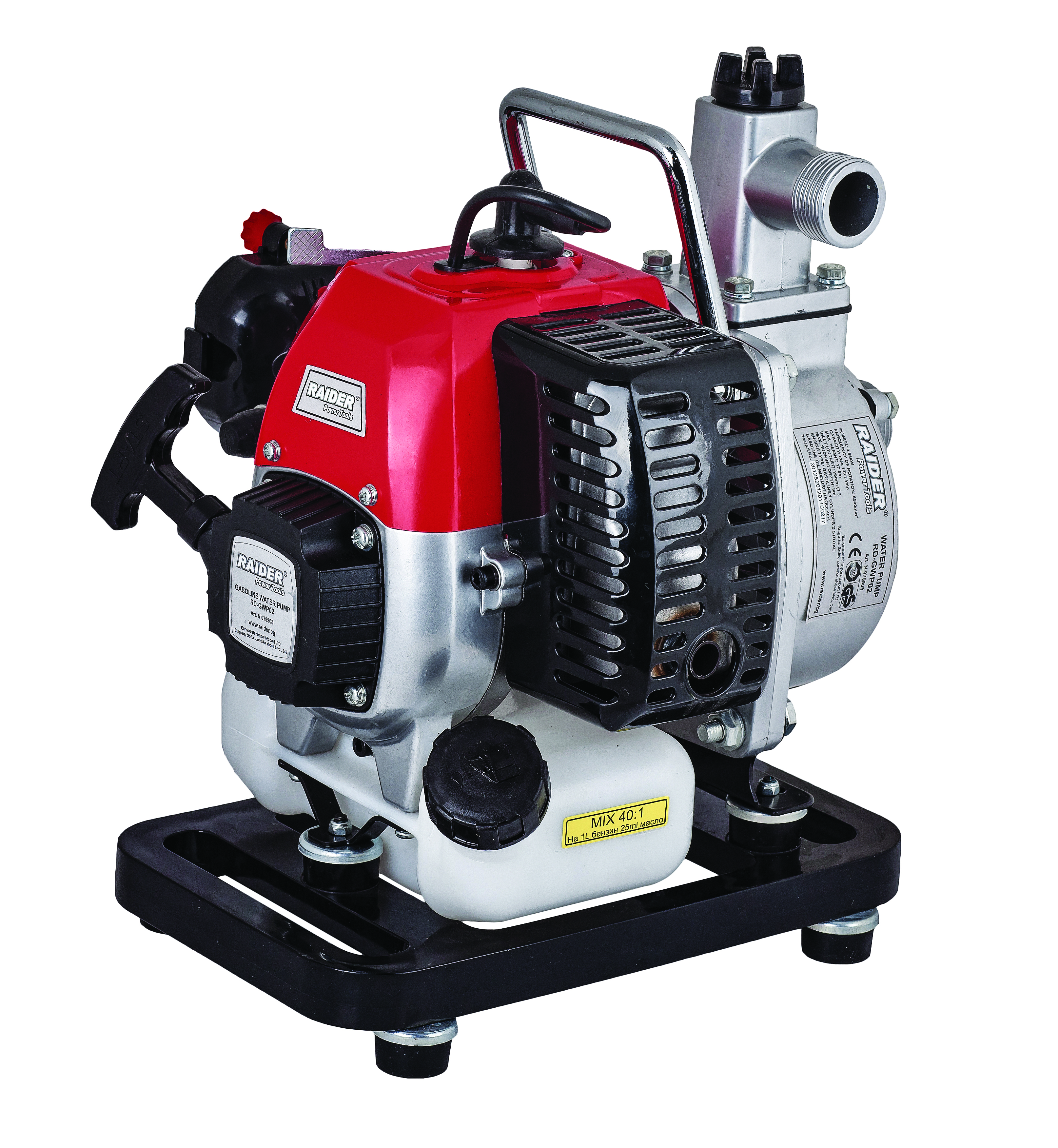 Бензиновата водната помпа RD-GWP02J е предназначена e за използване на места, намиращи се далеч от електропреносната мрежа, както и при непредвидени кризисни ситуации след наводнения и други събития. Изключително подходяща за изпомпаване на вода от басейни и други големи водосбори. Моделът се задвижва от едноцилиндров двутактов бензинов двигател с мощност от 0.83 kW.