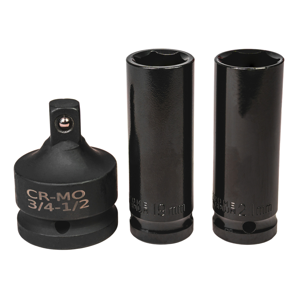 • В комплекта е включен преходник (адаптер) от 3/4" към 1/2", който дава възможност за използване на вложки с по-малък размер, като така разширява приложението на инструмента.
