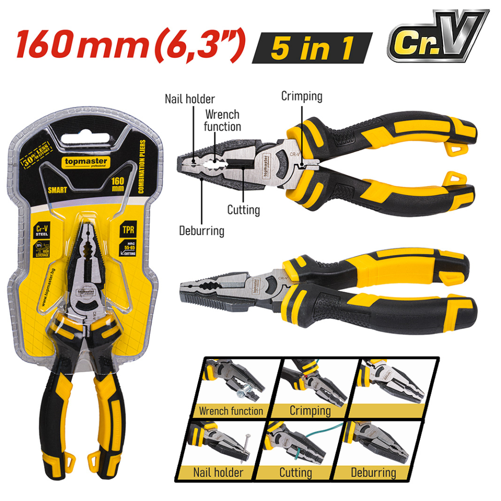 Клещите комбинирани SMART 160 mm TMP са надежден и висококачествен ръчен инструмент, предназначен за захващане, огъване и рязане на проводници, кабели и други материали. Те съчетават функциите на дългоустите клещи и резачките в един универсален инструмент, което ги прави отличен избор както за професионалисти, така и за домашни майстори.