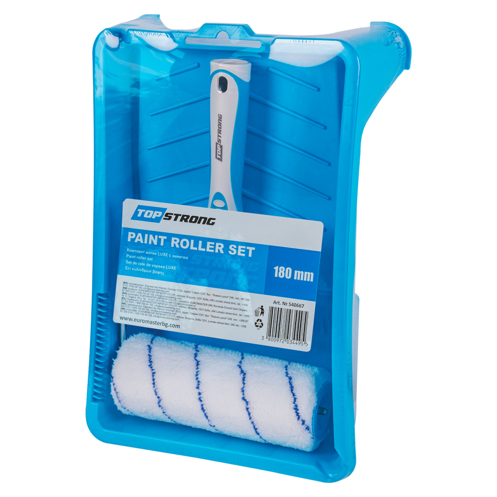 Валякът в комплекта е с ширина от 180 мм, което го прави подходящ за покриване на големи площи с по-малко усилия. Това е идеален размер за боядисване на стени, тавани и други големи повърхности, като осигурява равномерно нанасяне на боята