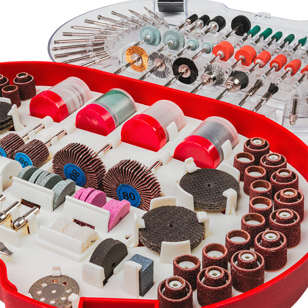 The set of 276 accessories is the perfect addition to any rotary tool, providing a wide range of applications—from fine grinding and engraving to cutting, polishing, and drilling