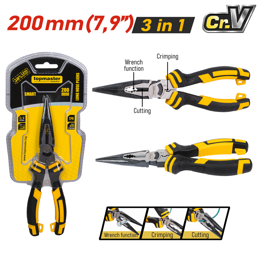 SMART 200 mm Long Nose Pliers TMP are a reliable and high-quality hand tool. Thanks to their greater length, they provide improved reach and better control, making them an excellent choice for both professionals and DIY users.