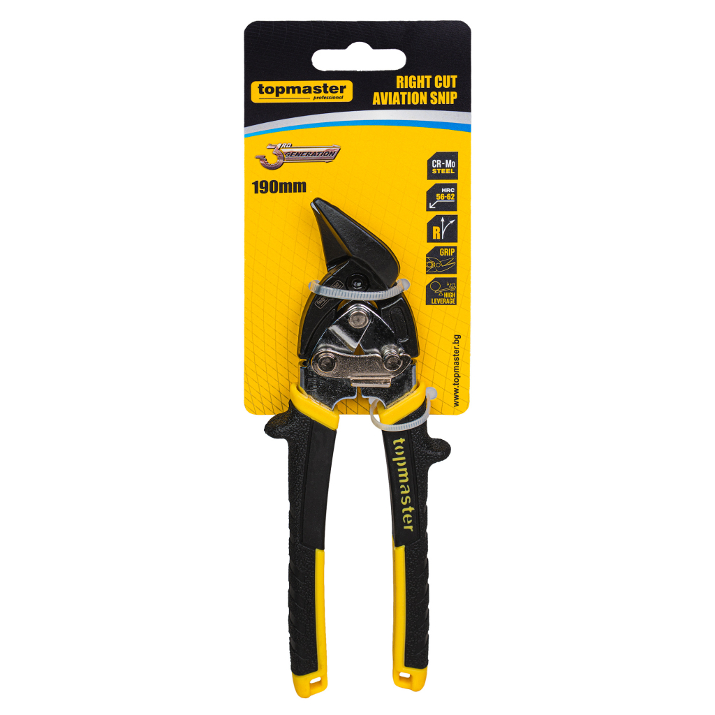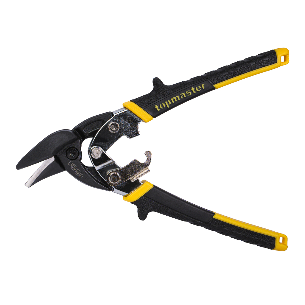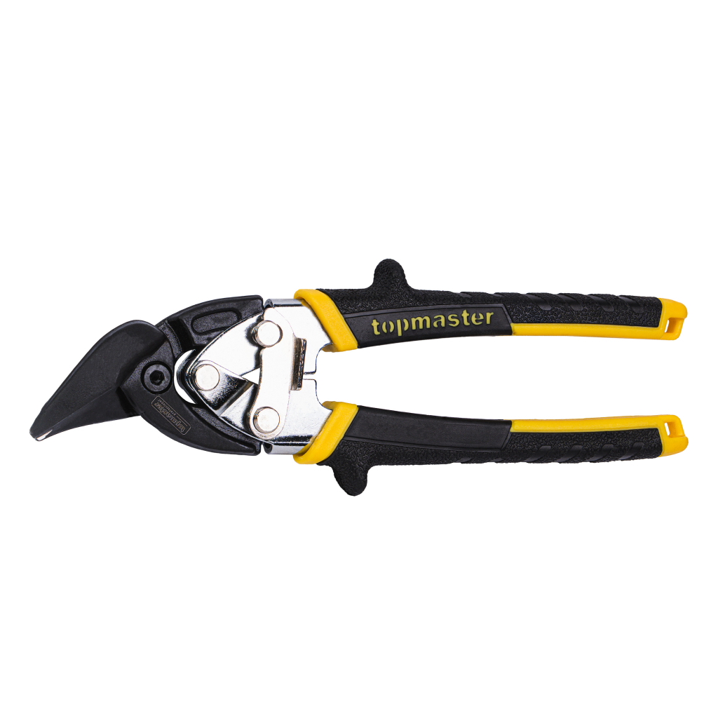 The reinforced Topmaster (TMP) right-cut tin snips are designed for precise and efficient cutting under intensive use. With a length of 190 mm and right-hand cutting blades, they are specifically engineered for right-hand curved cuts, trimming contours, openings, and various shapes, providing excellent visibility of the cutting line and stable control.