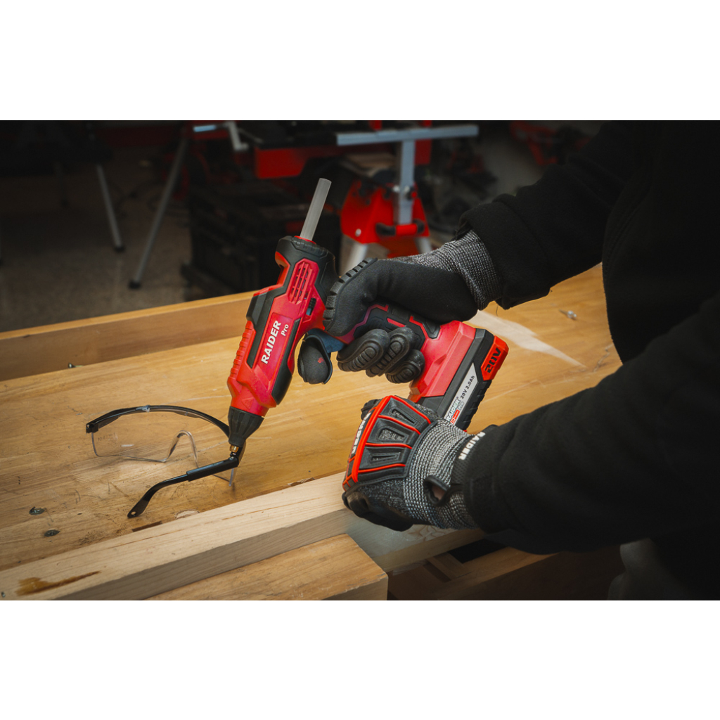 The RDP-SGLG20 Solo Cordless Glue gu enters operating mode after 15 seconds of heating. Extremely comfortable to work in tight spaces due to its compact construction. One charge of the battery is sufficient to use 6 glue sticks.