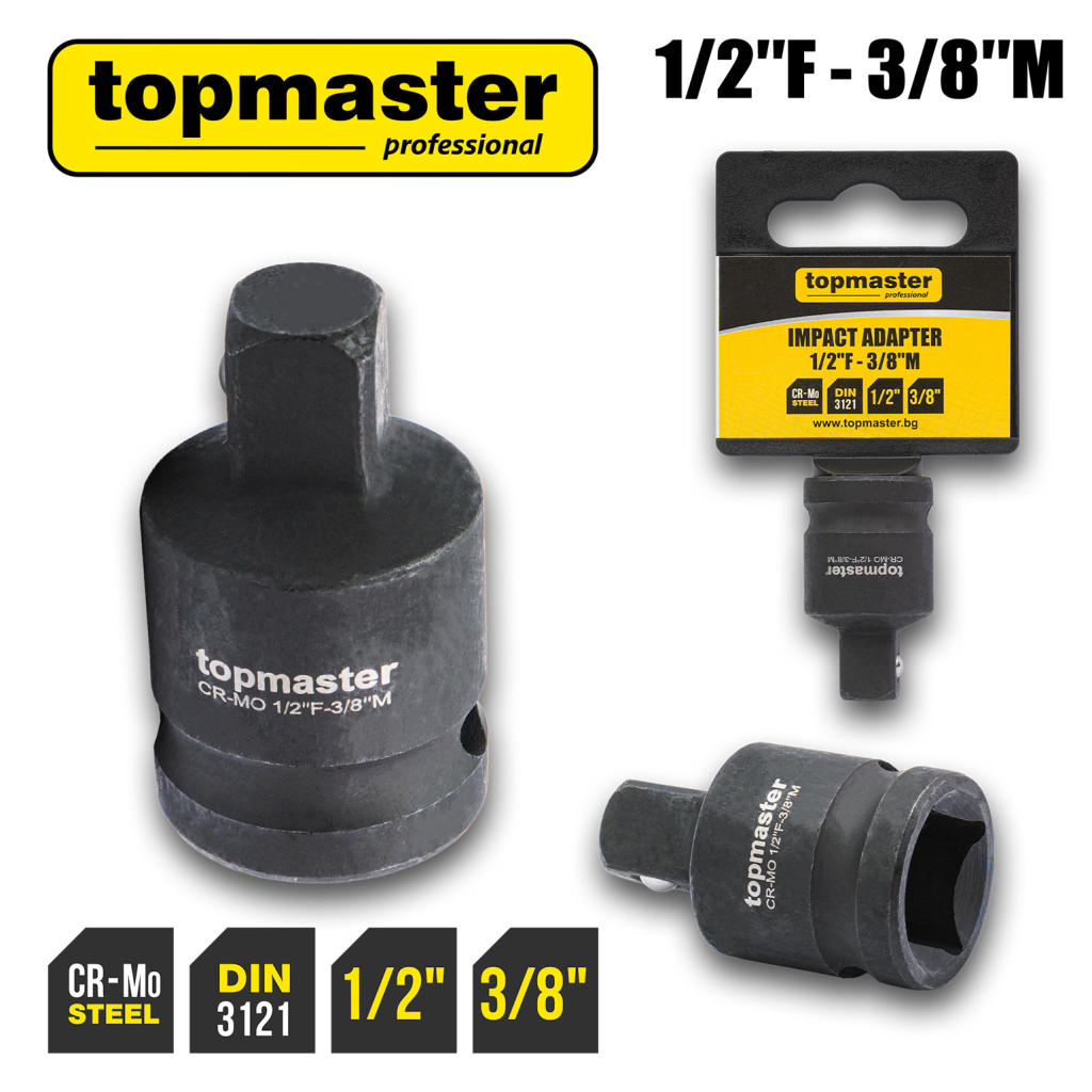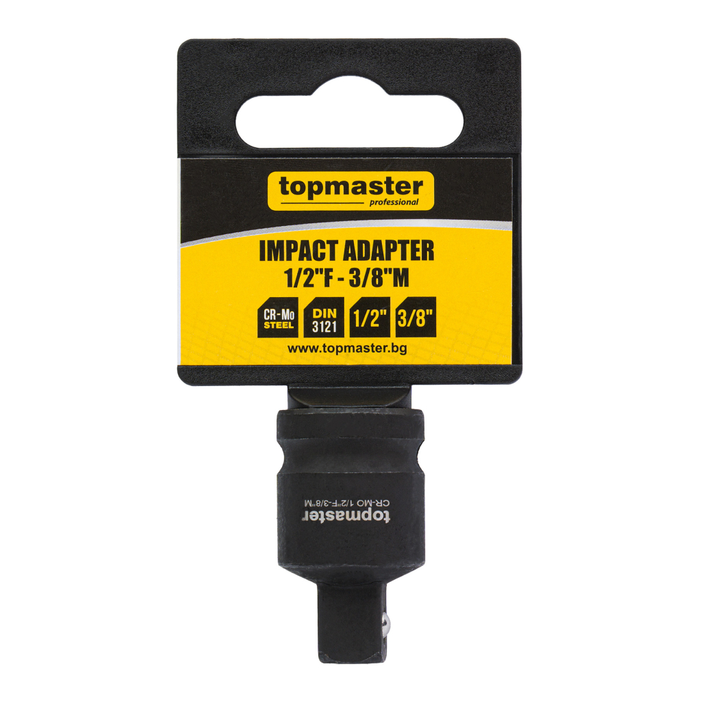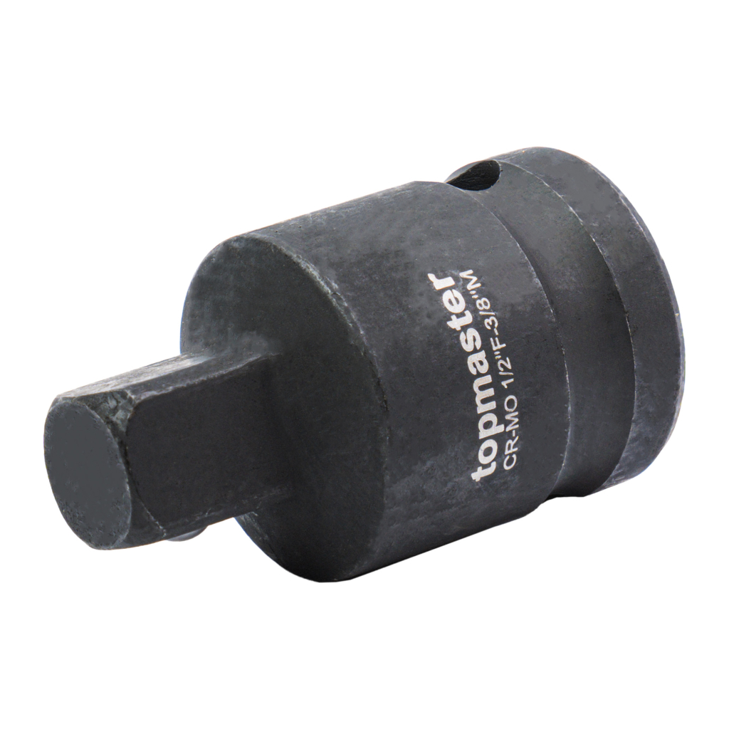 Ударният адаптер TMP 1/2F – 3/8M е предназначен за редуциране на присъединителния размер при работа с ударни и ръчни инструменти. Произведен от хром-молибденова (Cr-Mo) стомана, адаптерът осигурява отлична здравина и устойчивост на високи въртящи моменти.