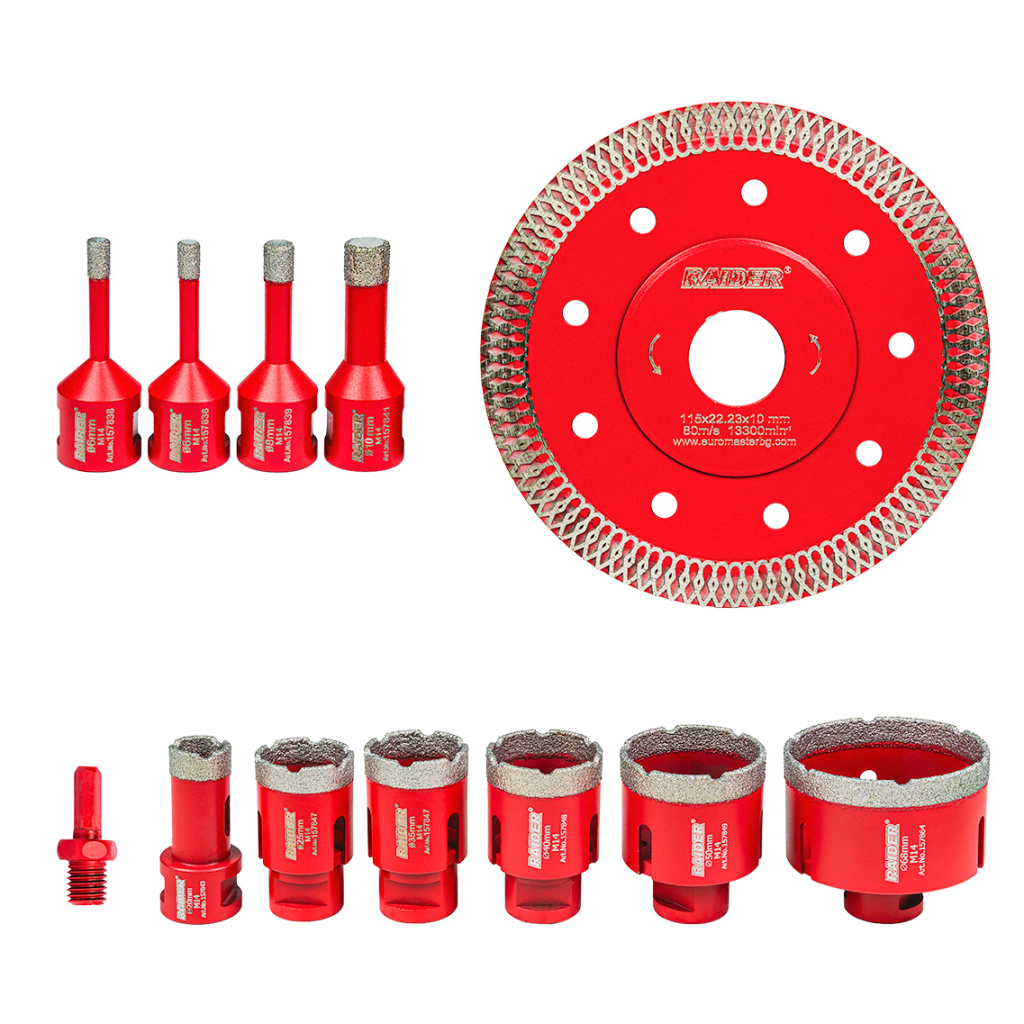 • Всички боркорони са снабдени със стандартна M14 резба, което ги прави напълно съвместими с повечето ъглошлайфи и гарантира лесен и бърз монтаж. В комплекта е включен и адаптер от HEX към M14, който разширява съвместимостта и позволява използване с бормашини и винтоверти.