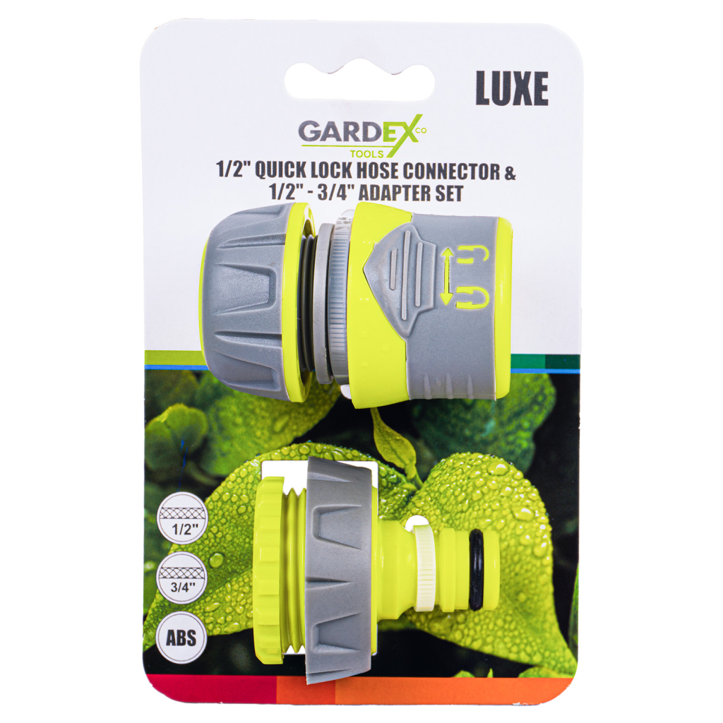 Комплектът LUXE GX включва конектор за маркуч 1/2" със заключване и адаптер 1/2"-3/4" – практично и надеждно решение за бързо свързване на маркучи към водоизточници с различен диаметър. Конекторът със заключващ механизъм осигурява стабилно и плътно прилягане, а адаптерът разширява съвместимостта с чешми и кранове с различни резби.